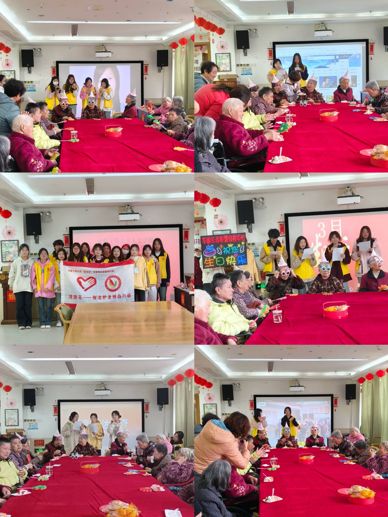 在芜湖华康医院,服务队受邀参加生日会活动。志愿者们协助医护人员布置活动现场,并与老人们交流互动、为寿星老人戴上生日帽,大家围坐在一起共同唱响生日歌。同时,向老人们详细宣讲“AI换脸冒充亲友”等典型数字骗局,进一步提高老年群体对诈骗的防范知识和意识。