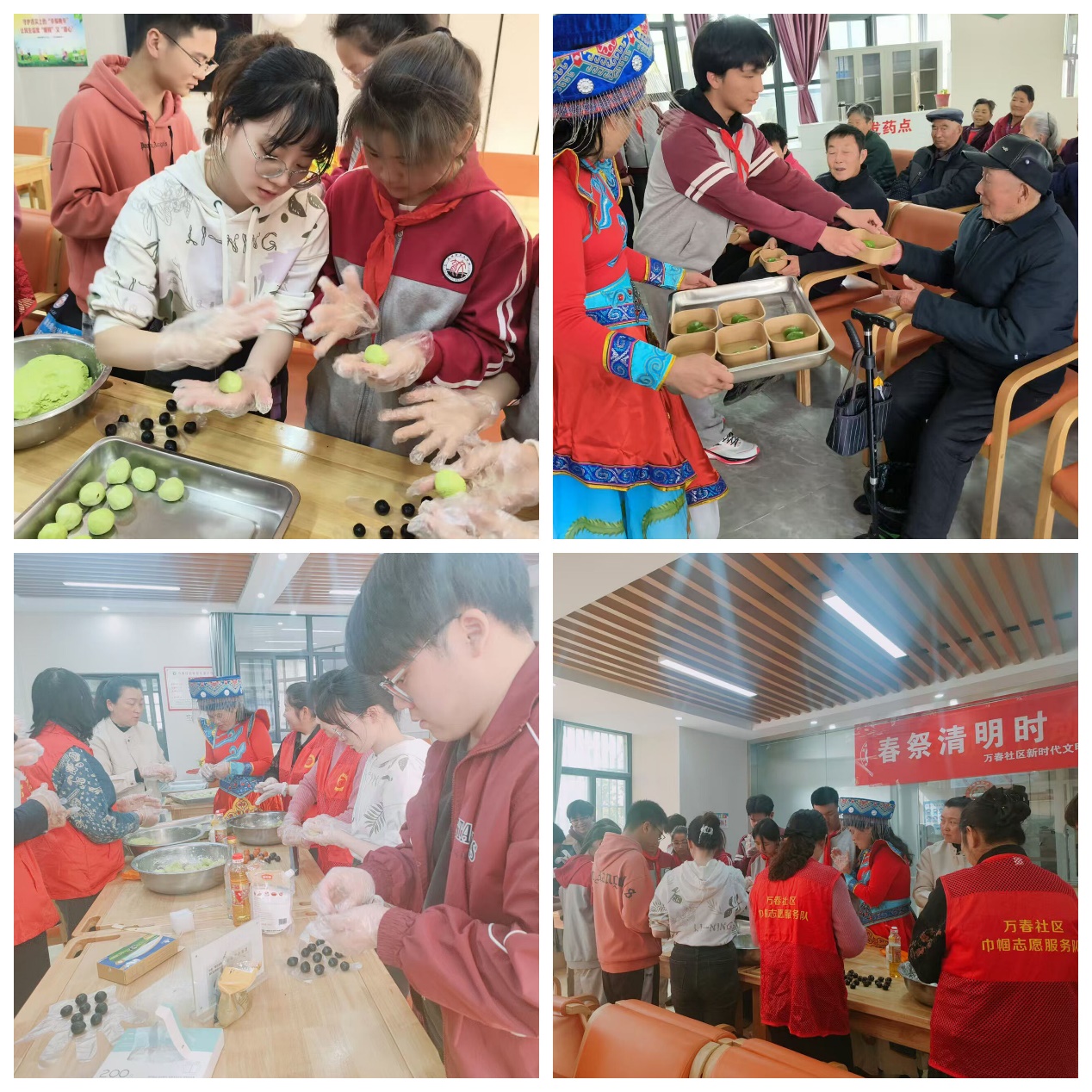 在社区工作人员带领下,学院志愿者与育文学校小学生们体验青团的制作过程,以艾草和其他绿色植物汁液与糯米粉混合,备好制成青团的材料,艾叶焯水后与糯米粉混合揉成团,作为青团外皮,加入咸蛋黄、豆沙、芝麻作为馅料增加青团风味。制作过程中,社区居民全家老小齐动手,揉面、包馅、蒸煮,温馨满满。蒸熟后的青团软糯弹牙,咬上一口,艾草的清香在舌尖散开,那是春天馈赠的美味,也是家的味道。制作完成后,学院志愿者和小学生们以及社区工作人员一起把青团送给社区老人们品尝。小小的青团,不仅包裹着春天的味道,更承载着对传统美食的热爱,以及制作过程中的点点滴滴温情。