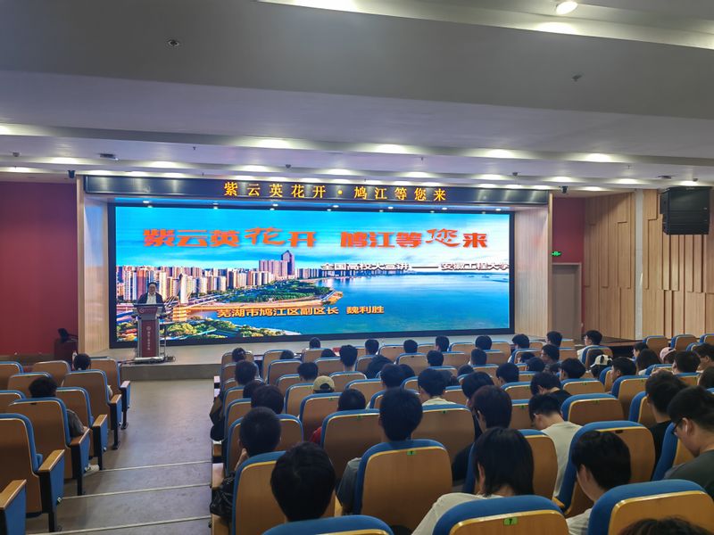 魏利胜从鸠江区的人文底蕴、交通网络、产业发展、创新体系等方面详细介绍了鸠江区的相关情况。并从实习有保障、就业有补贴和服务有温度等三个方面介绍了鸠江区的人才政策。他指出,当前鸠江区正奋力实现“冲刺一千亿、跻身百强区、勇当高质量发展开路先锋”的目标任务,他诚邀我校学子学在鸠江、留在鸠江,助力实现“鸠”地起飞。