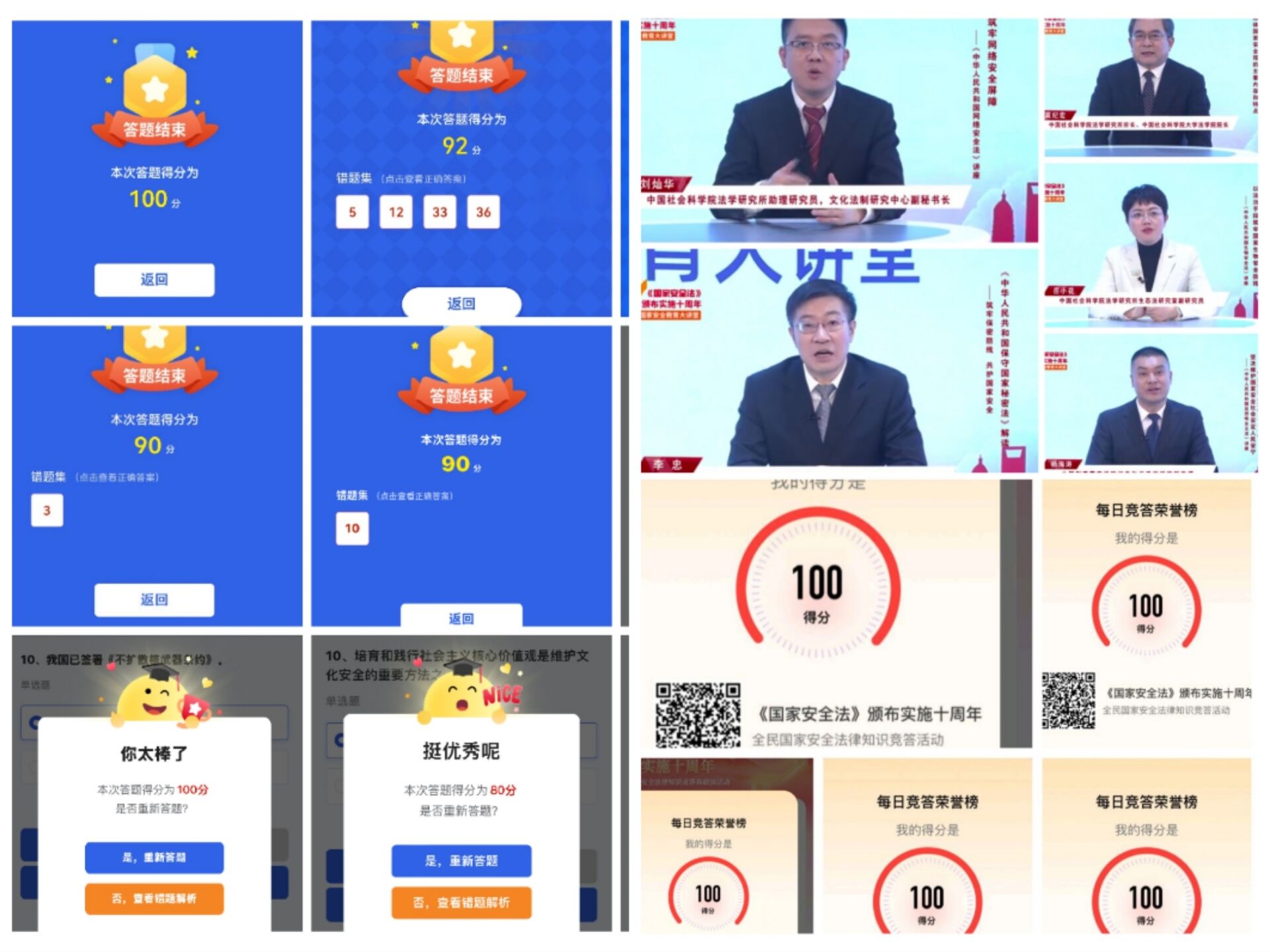 采用“线上学+趣味答”形式,积极动员学生观看“千万师生同上一堂国家安全教育课”、高校国家安全视频公开课,并参与《中华人民共和国国家安全法》颁布实施十周年国家安全法律知识竞答和朗读活动、“全国大学生国家安全知识答题”活动,引导学生在维护国家主权、安全、发展利益的火热实践中挺膺担当,为强国建设、民族复兴贡献青春力量。