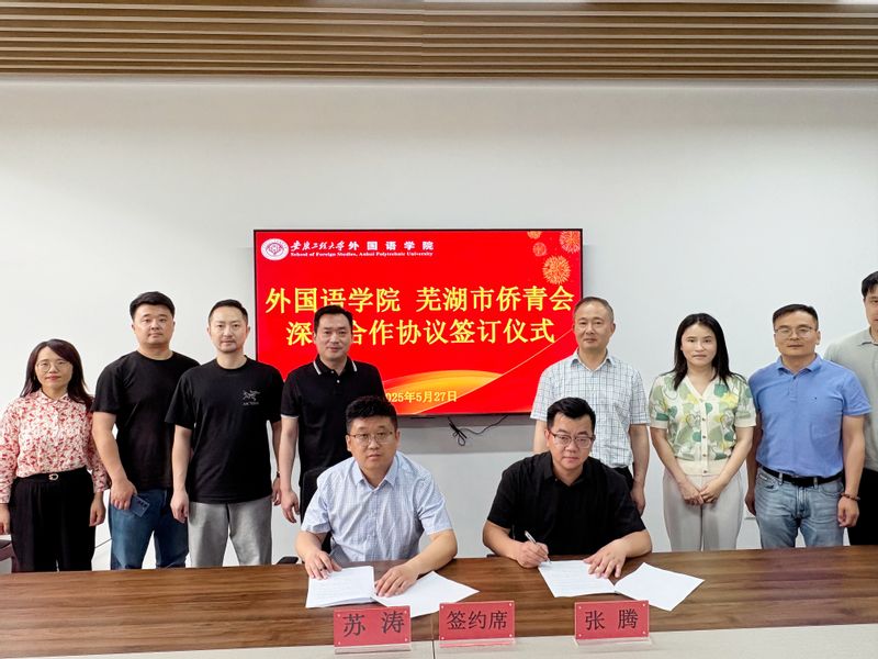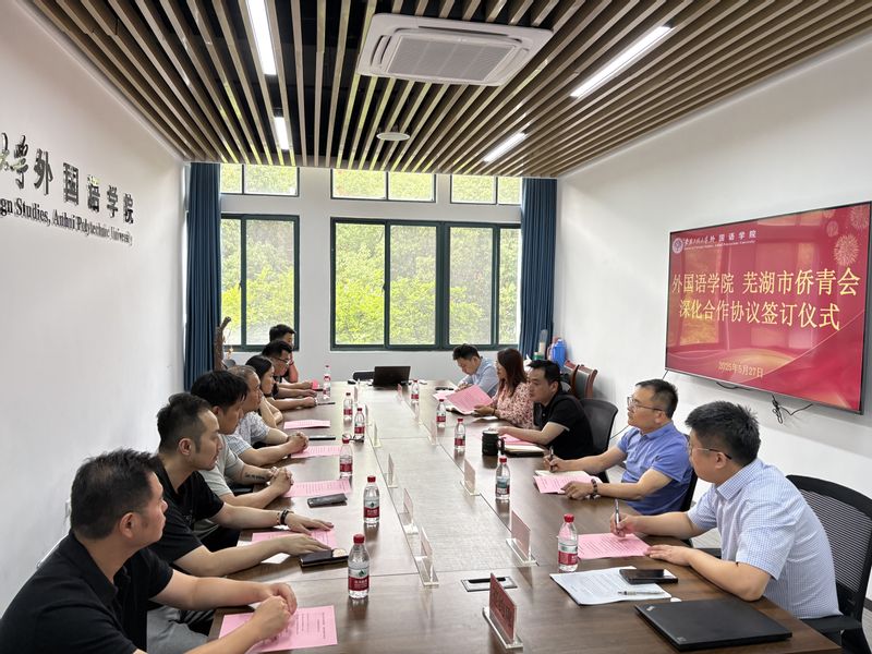 本网讯 5月27日,外国语学院与芜湖市侨联青年委员会签署深化合作协议暨新文科人才实践能力培养横向项目签约仪式在学院211会议室举行。芜湖市侨联党组书记、主席李东方,副主席孙茹,芜湖市侨青会会长、安徽东汇储运股份有限公司总经理汪国罕,副会长兼秘书长、安徽恩瑞医疗总经理汤瑞,副会长、安徽奈思教育投资管理有限公司总经理郑锐,副会长、芜湖同泰智能物流园有限公司总经理张腾,副会长、深圳道瑞轮胎有限公司执行董事易昊,外国语学院党委书记董金权,副院长李新国、韩利敏等共同出席活动。