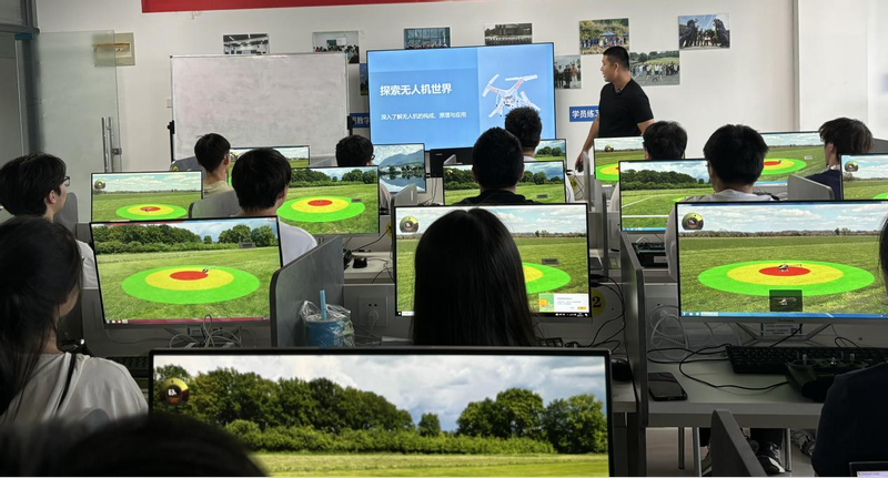 在基地宛新飞行学院,学生们进行了无人机理论知识学习、无人机模拟飞行体验,并近距离观看了无人机的实地飞行演示。在技术专家的指导下,学生们了解了无人机的基本原理、构造及飞行操控知识,通过仿真软件体验了无人机飞行的基本操控。在学院的无人机飞行场地,无人机专业教练展示了无人机精准起飞、悬停及安全降落等一系列操作。当学生们近距离看到无人机平稳升空、俯瞰大地时,大家无不惊叹于科技的力量,探索科技前沿的热情油然而生。