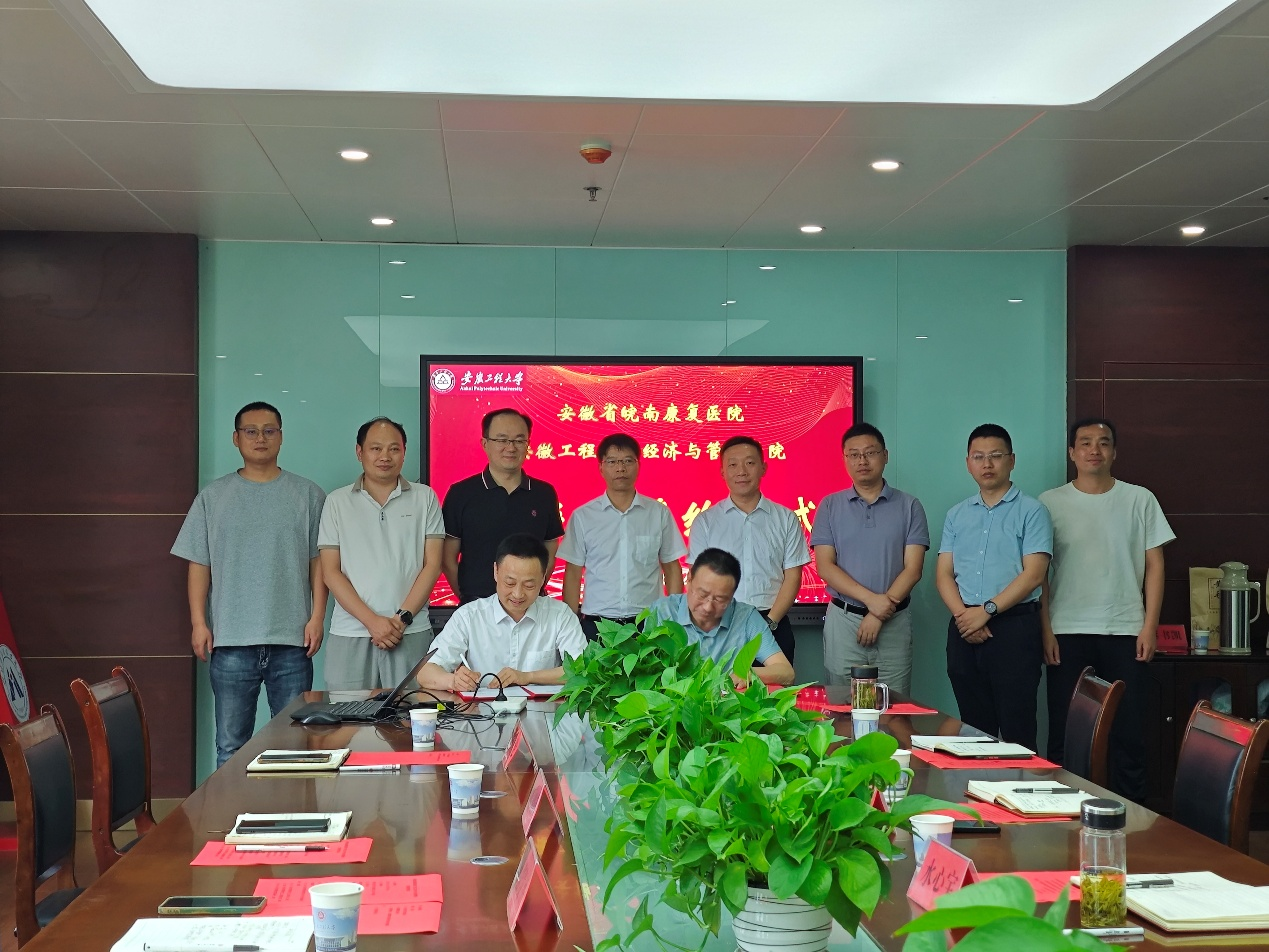 本网讯 6月27日,经济与管理学院与安徽省皖南康复医院合作签约仪式在学院C座818会议室举行。安徽省皖南康复医院党委委员、副院长胡剑辉,相关科室负责人,经济与管理学院党委书记水心宝,院长龚本刚,学院相关老师参加了签约仪式。仪式由数字经济与产业发展研究所所长汪磊主持。